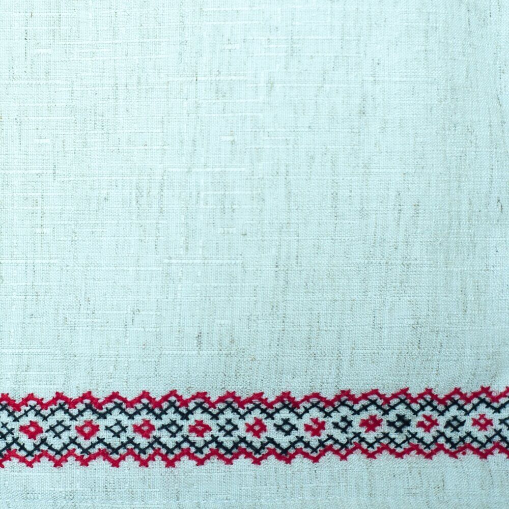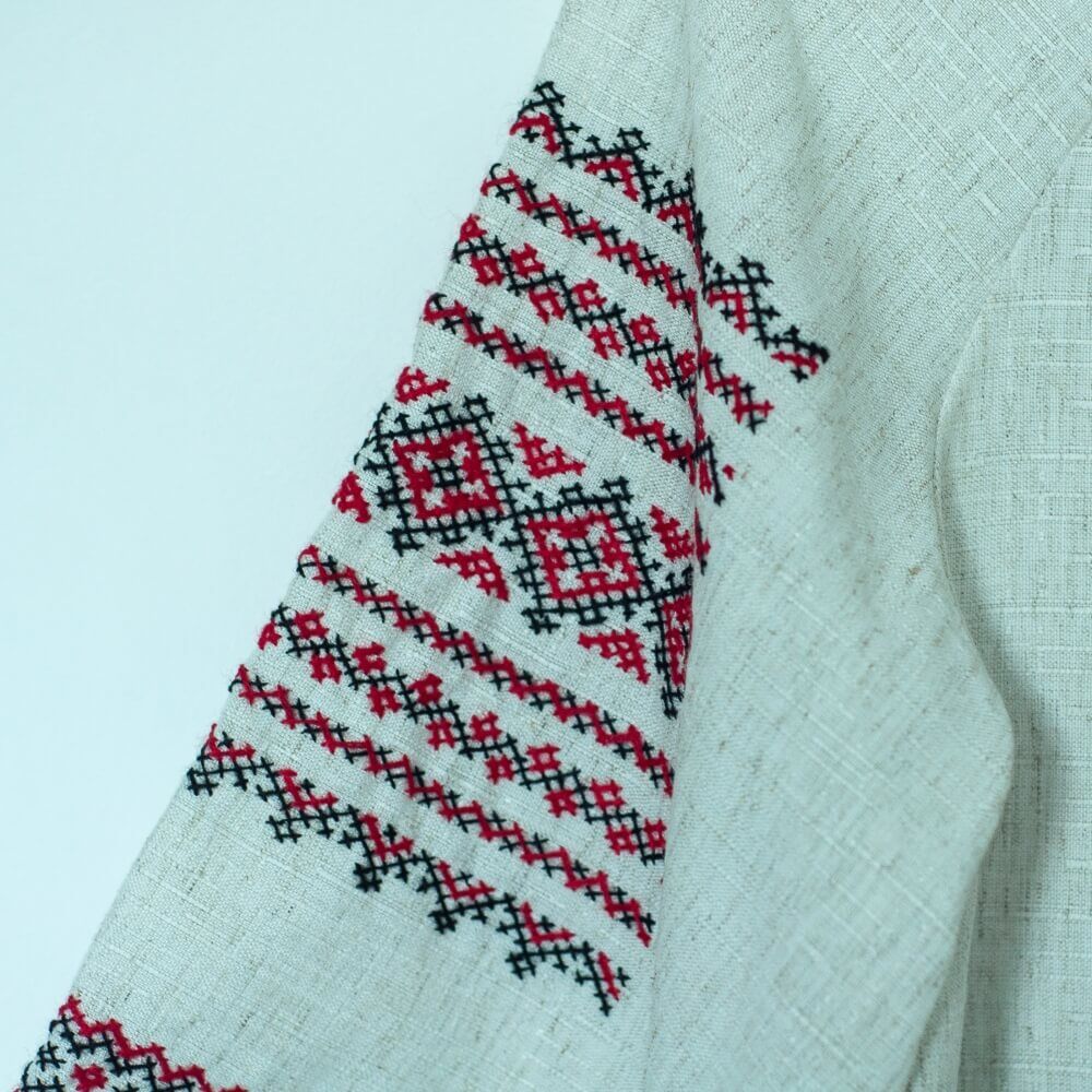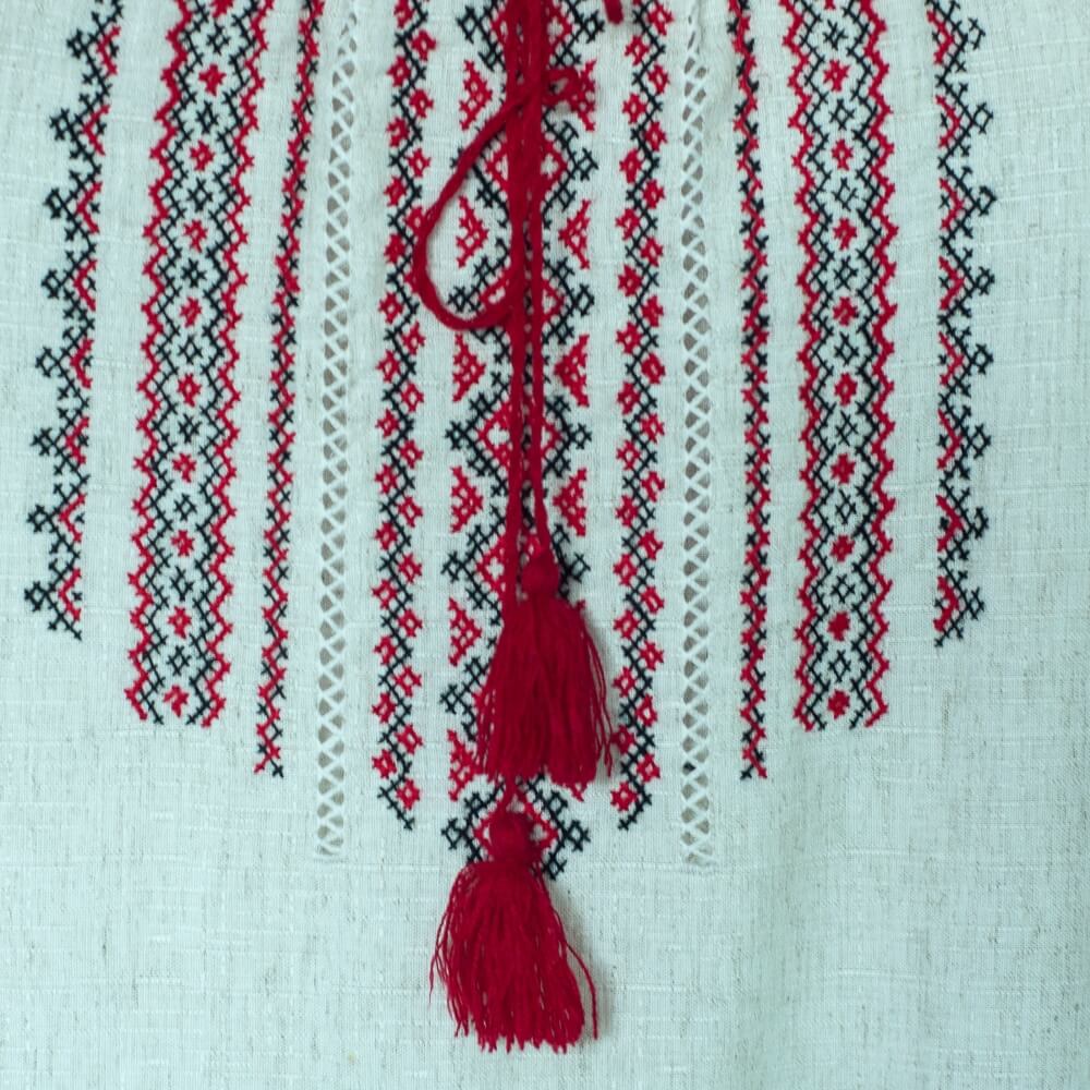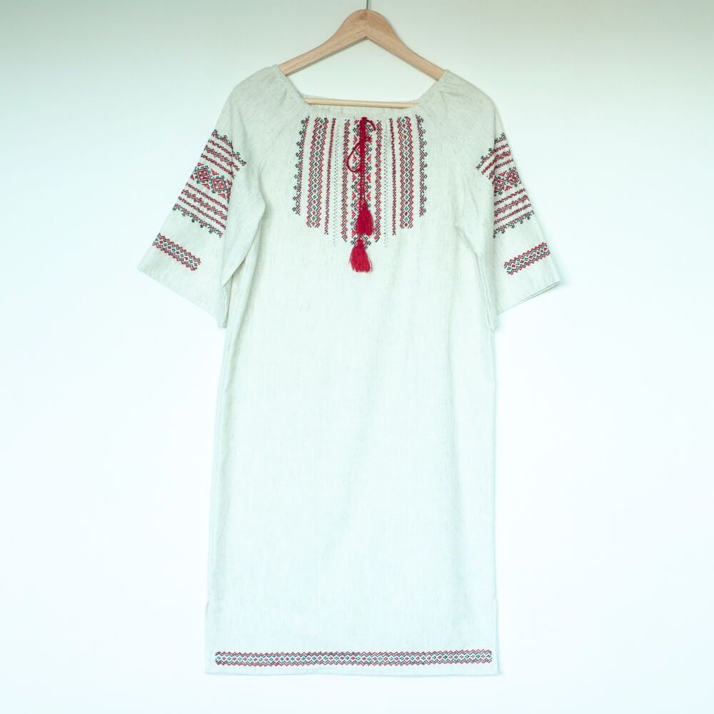 Linen dress from Humor, Bucovina, with hand-made red embroidery. A modern version of the Romanian blouse that can be worn on special occasions, but also as a casual dress.